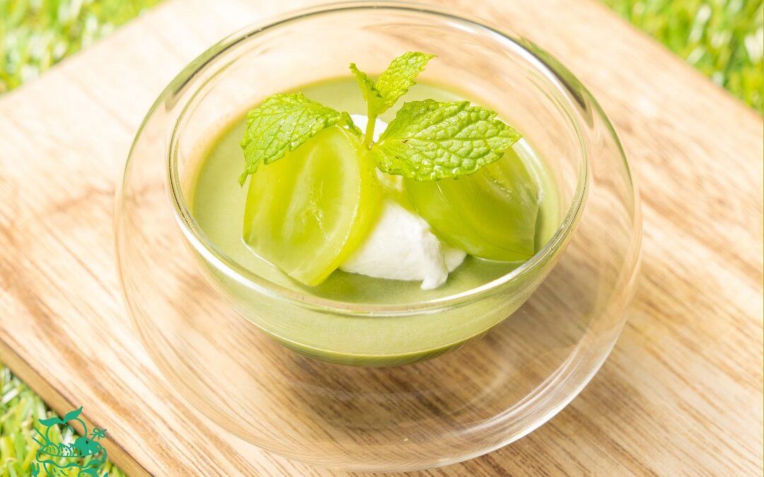 抹茶とぶどう!?と初めは思ったのですが、これまた相性抜群…抹茶のパンナコッタのほろ苦さを、シャインマスカットの弾けるような甘さが引き立てています❣️3個くらい食べたい…